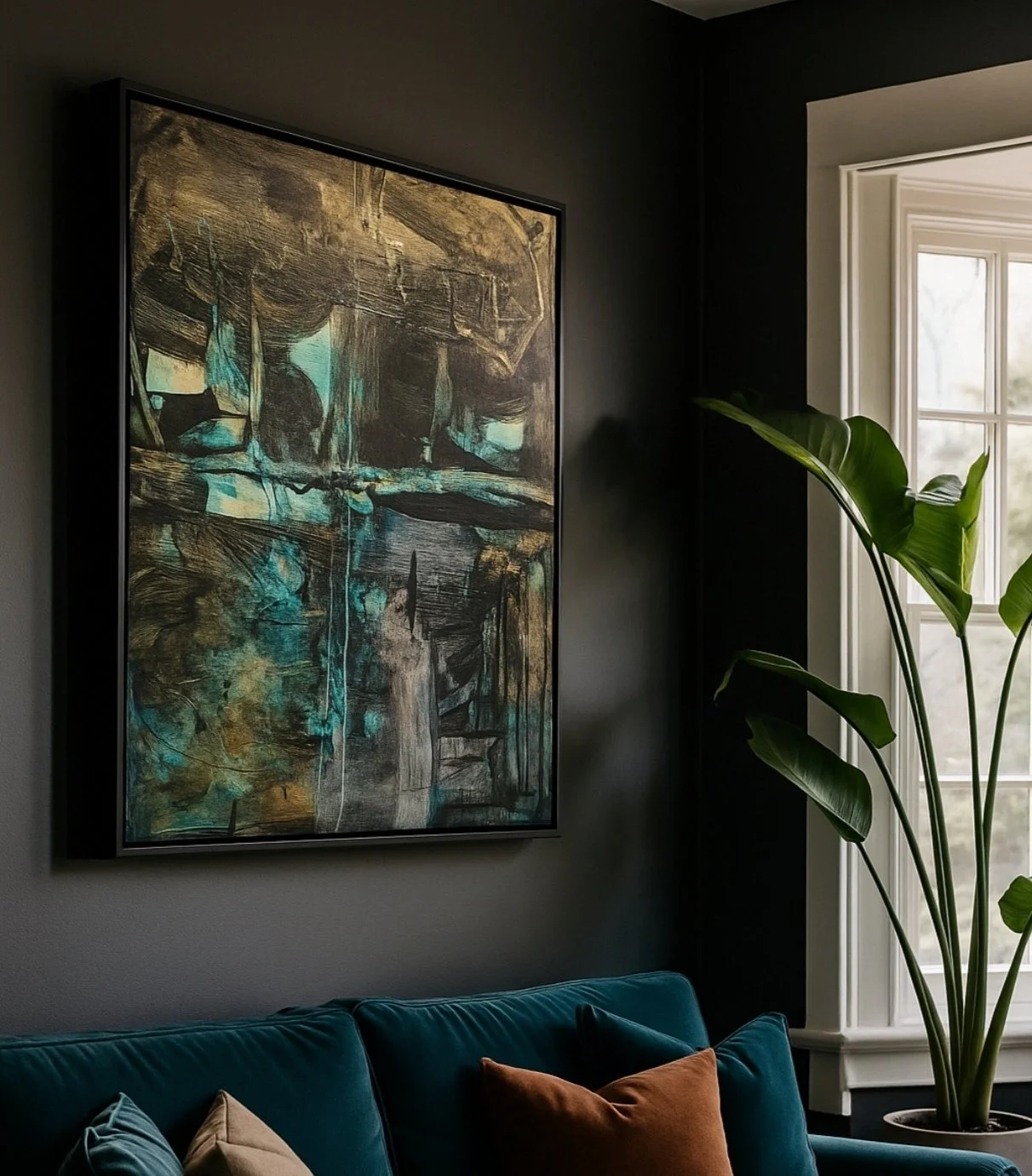 *Please note that AI has been used solely to provide an example of how the artwork may appear in an interior environment.For any enquires or additional imagery and video of this painting please contact hello@alexanderrhys.com